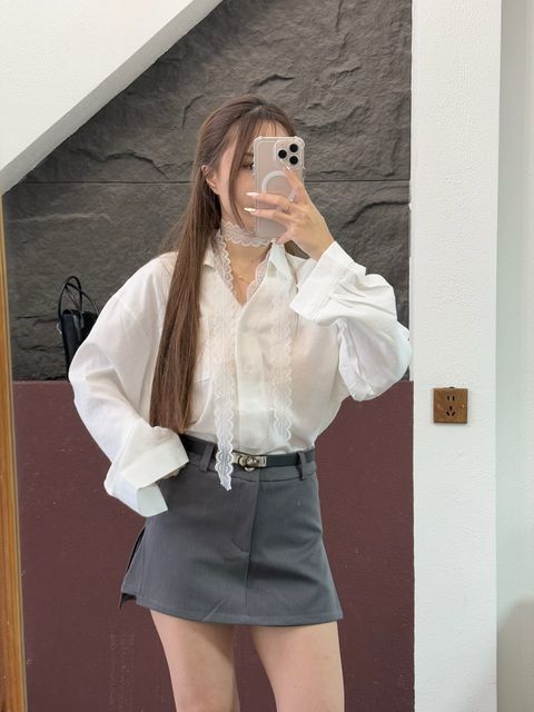 T3845 | 格纹蕾丝边娃娃衬衫上衣