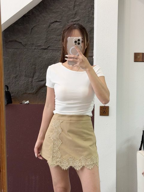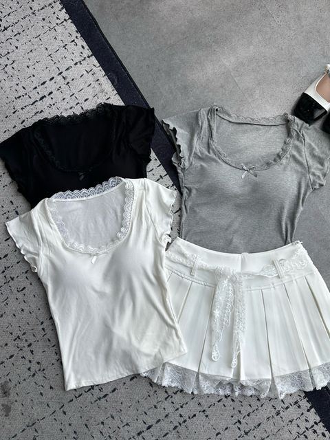 T3800 | 撞色圆领拼接蕾丝字母皱褶上衣